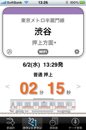 アプリを起動したら、「データ管理」画面で時刻表データをダウンロードし、「駅選択」画面で乗車駅を選びます。すると、駅名、次の電車の発車時刻、行き先などが表示され、オレンジ色の大きな数字でカウントダウンが始まります。はたして時間切れになる前に電車に乗れるのか、ちょっとしたスリルを味わえるでしょう。