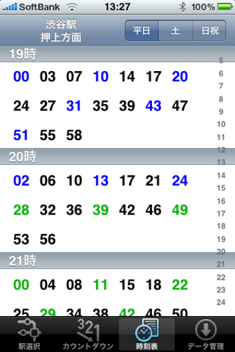 画面を右にスライドさせていくことで、終電までの全電車のカウントダウンを表示させることもできます。「次の電車を逃したらあと何分待たなければならないか」、「次の急行電車は何分何秒後に来るのか」などもすぐ分かるでしょう。一方、「時刻表」画面では、一日の全ての電車の発車時刻を一覧で見ることができます。
